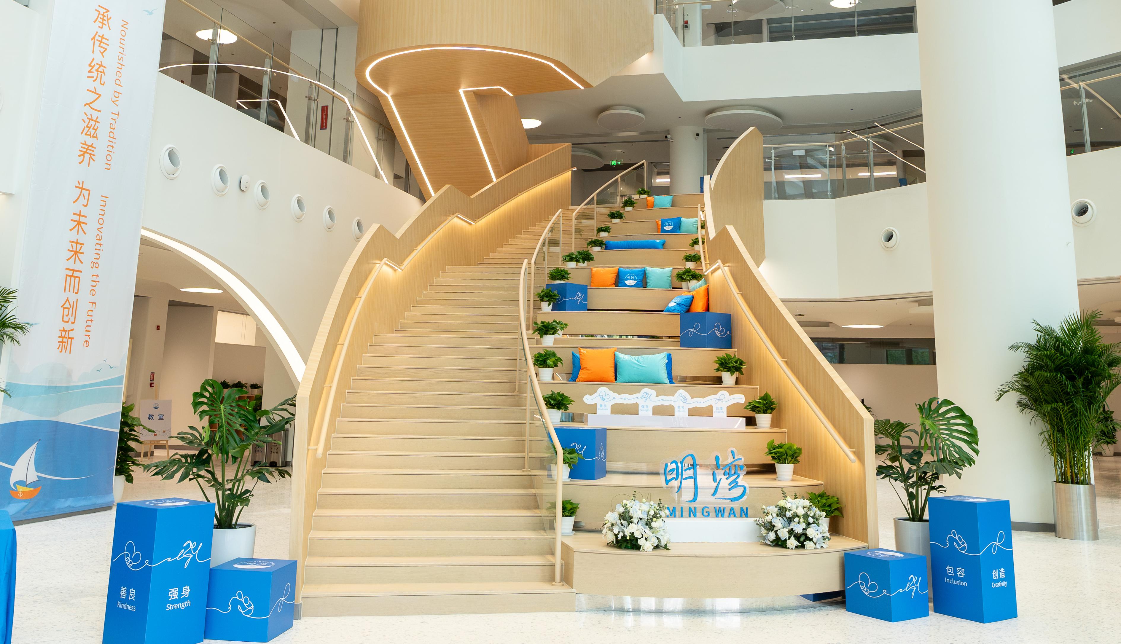 “明湾”,犹如在夜航的飞机上,俯瞰一片湾区,湾上明亮璀璨,内心温暖光明。“明”是光与暖之交融,“湾”是陆与海之连接。明湾之名,蕴含着我们对这所学校深深的期许。